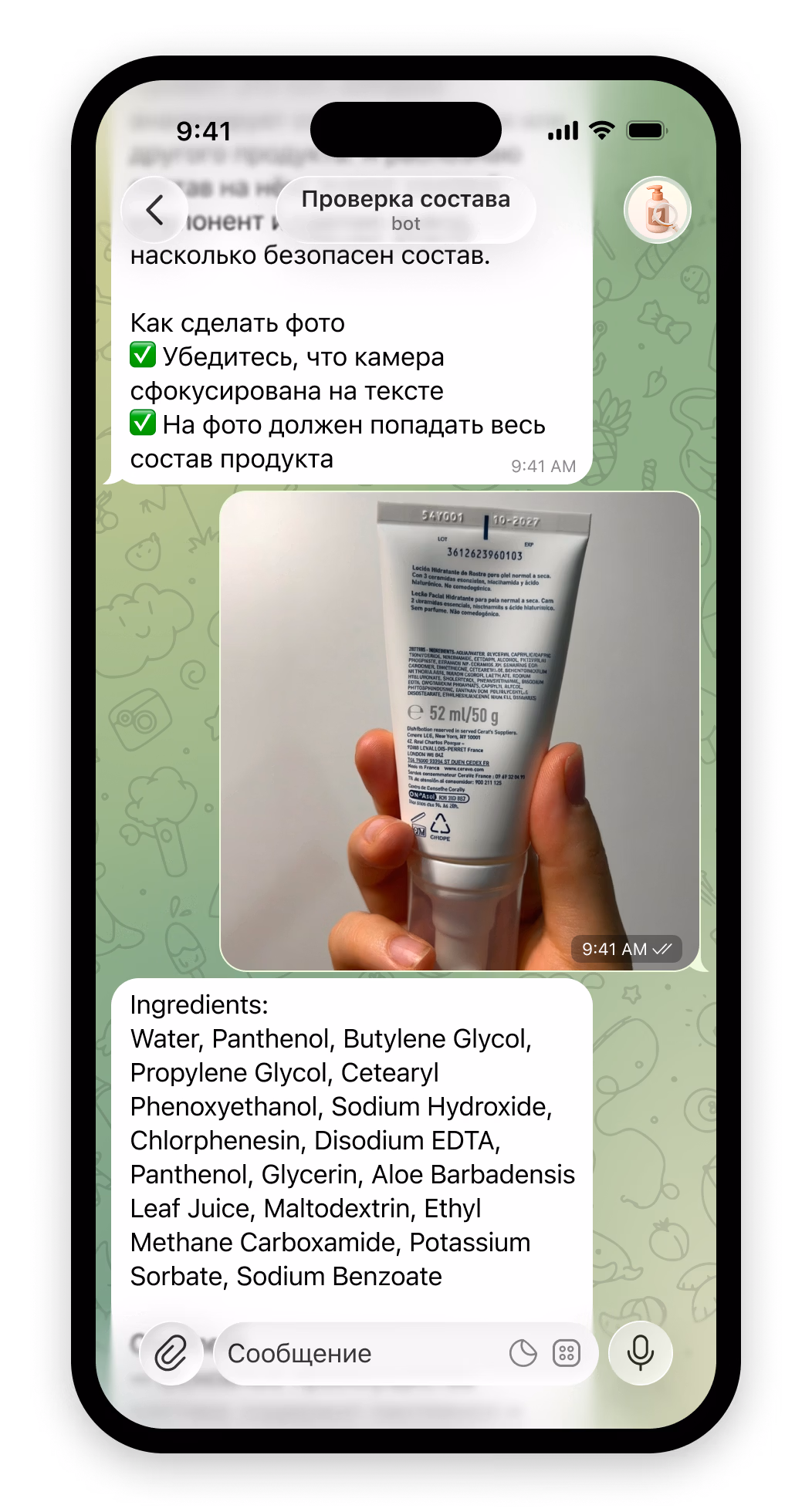 Бот для проверки состава позволяет загрузить фото косметики или продукта питания и получить подробный анализ каждого компонента